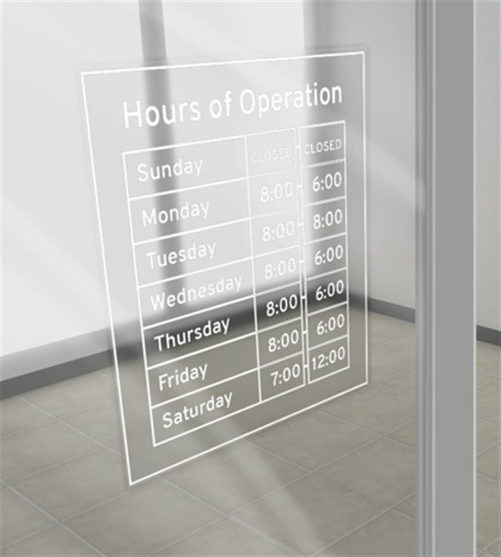 White lettering on clear vinyl with assortment of numbers to customize your service hours. Designed for placement in service drive.